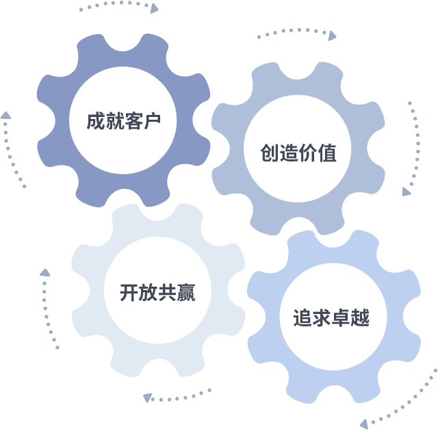 成就客户是一切决策的出发点,,创造价值是衡量所有工作的标准,,,,追求卓越是我们做事做人的态度,,,,开放共赢是我们的格局也是最终的结果。。价值观的齿轮环环相扣,,,推动着组织里的每个人不断向前。。。。
